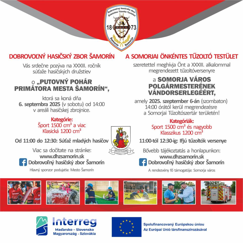 Dobrovoľný hasičský zbor Šamorín aj tento rok srdečne pozýva obyvateľov mesta na XXXIII. ročník hasičskej súťaže O putovný pohár primátora Mesta Šamorín. Podujatie sa uskutoční v sobotu 6. septembra 2025 od 14.00 hod. v areáli šamorínskej hasičskej zbrojnice. Súťažné tímy si zmerajú sily v kategóriách šport 1500 cm³ a klasika 1200 cm³.