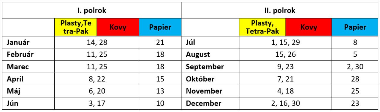Odbor životného prostredia Mestského úradu Šamorín oznamuje, že zber vytriedeného papiera, kovov, plastov a viacvrstvových obalových materiálov v jednotlivých uliciach a mestských častiach sa v roku 2025 uskutoční v nasledovných termínoch: