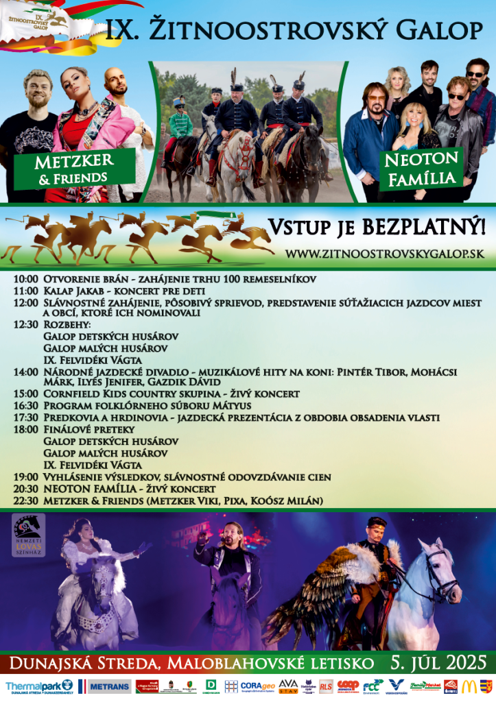 O IX. Žitnoostrovský galop bol zo strany jazdcov veľký záujem. Na jazdeckej dráhe pripravenej na maloblahovskom letisku súťaží 18 jazdcov v troch kategóriách. Štartuje Žitnoostrovský galop, Galop detských husárov, a z programu nechýba ani Galop malých husárov. Galop je však rozhodne viac, než iba akési športové podujatie. Organizátori pripravili programy pre všetky vekové kategórie, od najmenších až po najstarších. Záujemcov čakajú veselé destské programy a veľkolepé koncerty, ako aj Ulica chutí Žitného ostrova, či Dvor remeselníkov.